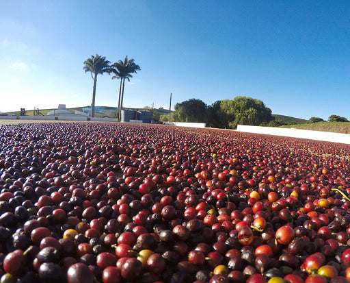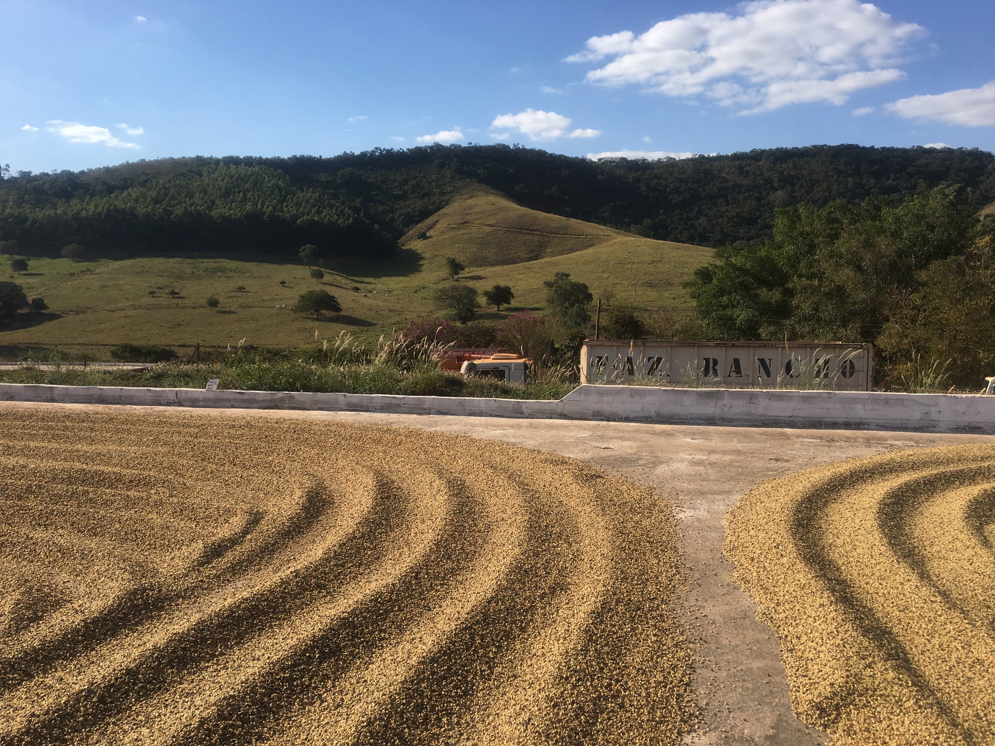All coffees in the blend are dried in static boxes, 1m deep containers that hold around 25–30 bags of green coffee. Air is circulated from below to keep the temperature under 40°C, with thermometers monitoring the process. The coffee isn’t moved during drying, which helps develop more fruity, expressive flavours compared to typical Brazilian naturals. After drying, it rests for one to two weeks before milling.